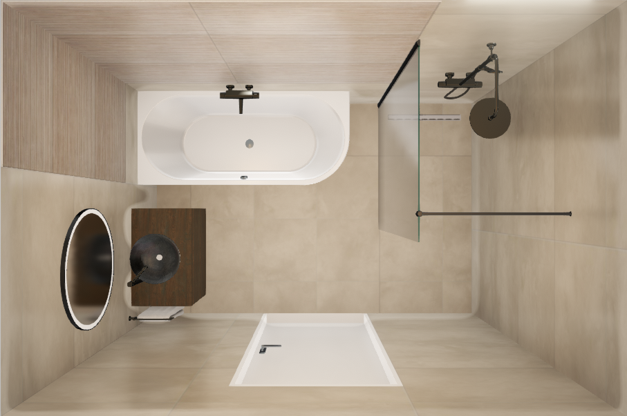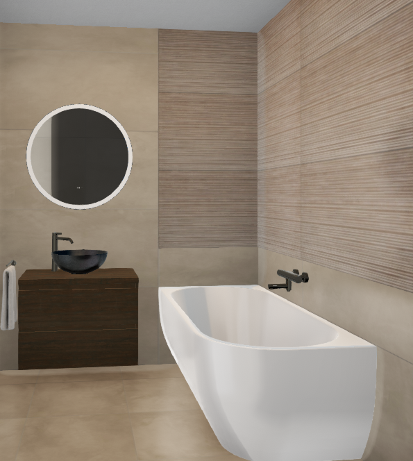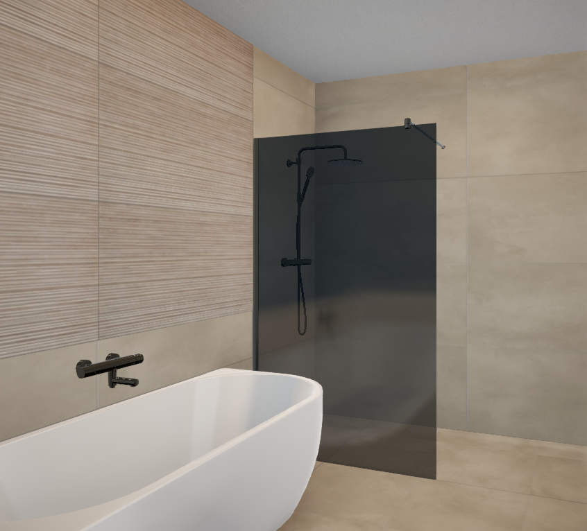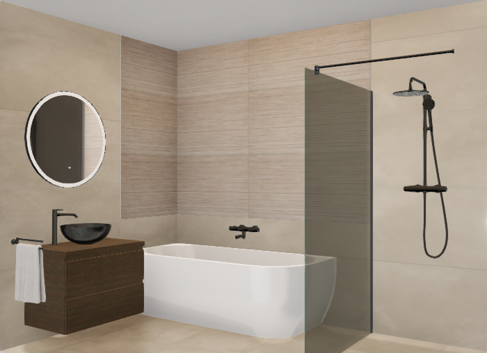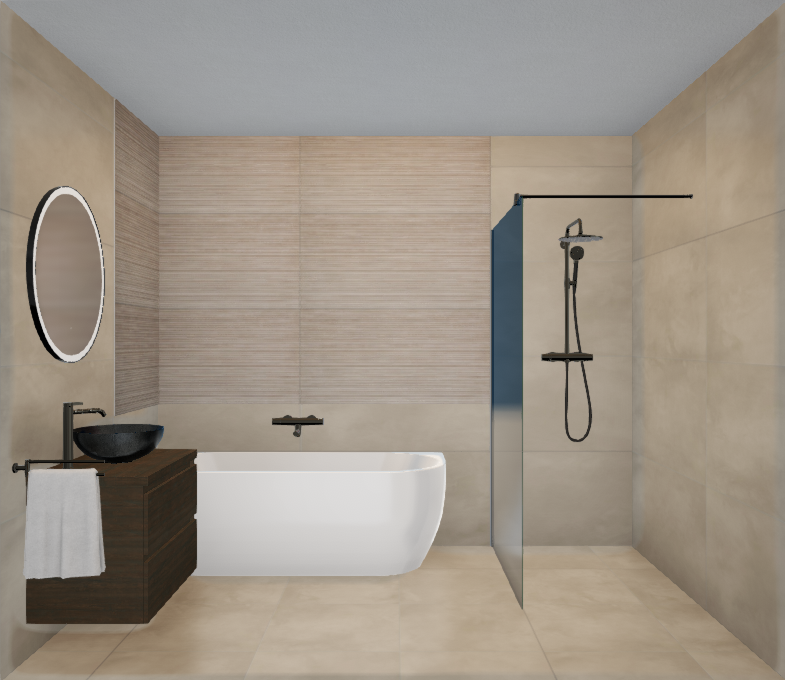 Badkameropstelling BTB 2 Een moderne, natuurlijke uitstraling met warme bruine tinten en structuur in het prachtige decor. De combinatie van donkere details en reliëftegels geeft deze ruimte een stijlvol contrast en een rustige, elegante sfeer.